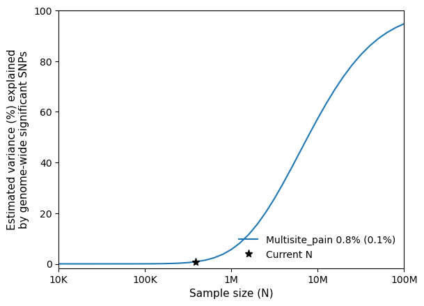 As befits a polygenic trait with weak effects, a very large sample size would be required to explain a significant proportion of SNP heritability. This is illustrated by the power plot: